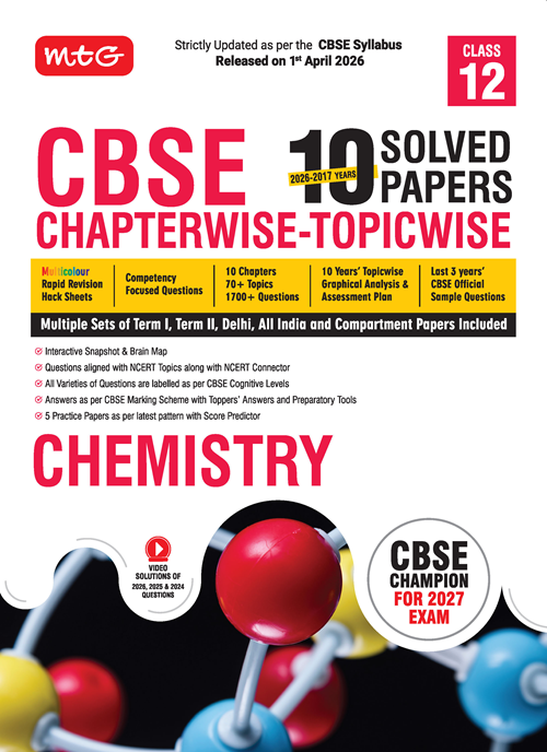 MTG’s CBSE Champion is an essential study resource for CBSE Board exams. It has previous 10 years of questions from CBSE Board Exams (2017-2026) in a chapter-wise and topic-wise format. It also comprises video solutions of CBSE Board 2026, 2025 and 2024 questions with ideal techniques of solving questions.