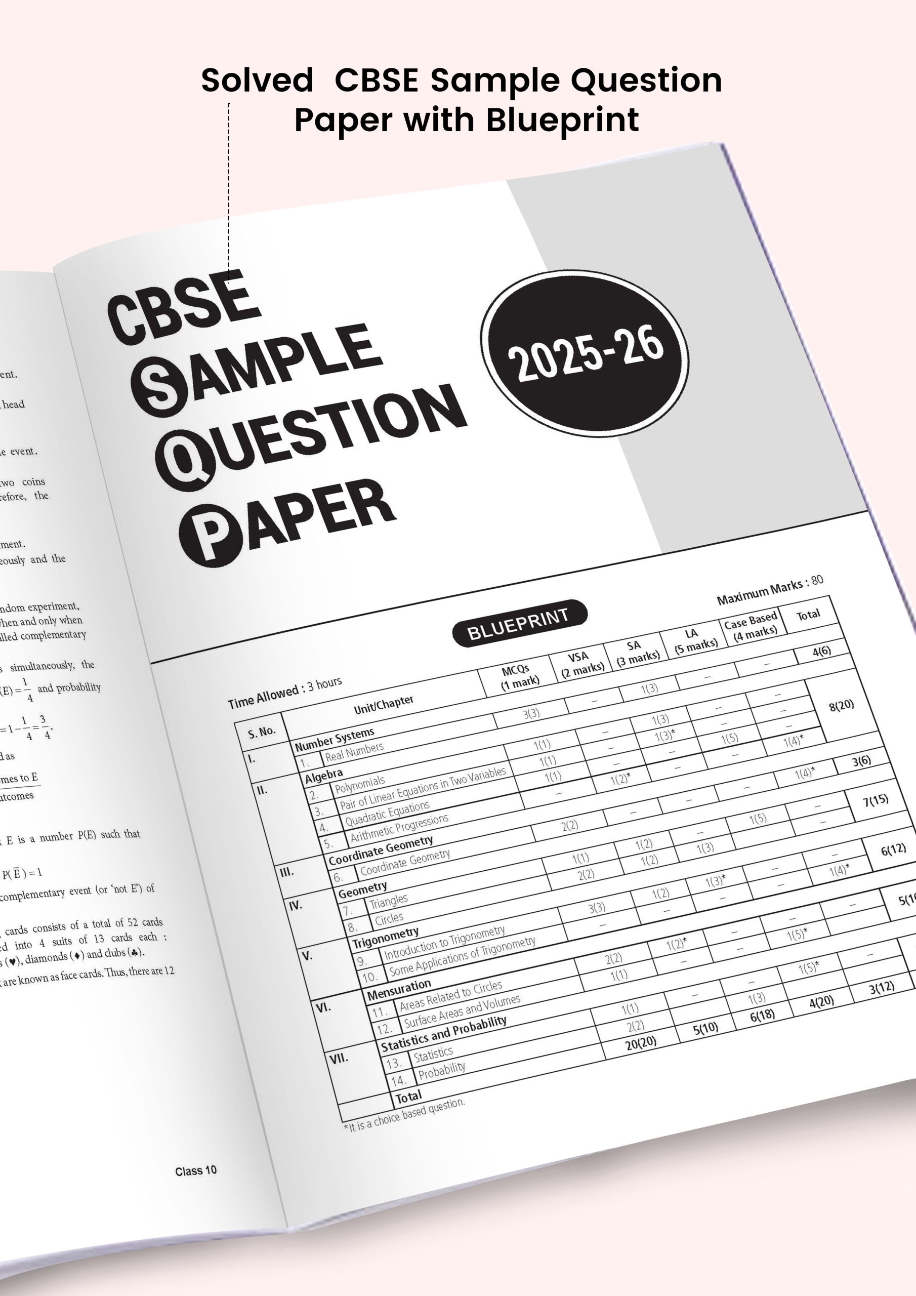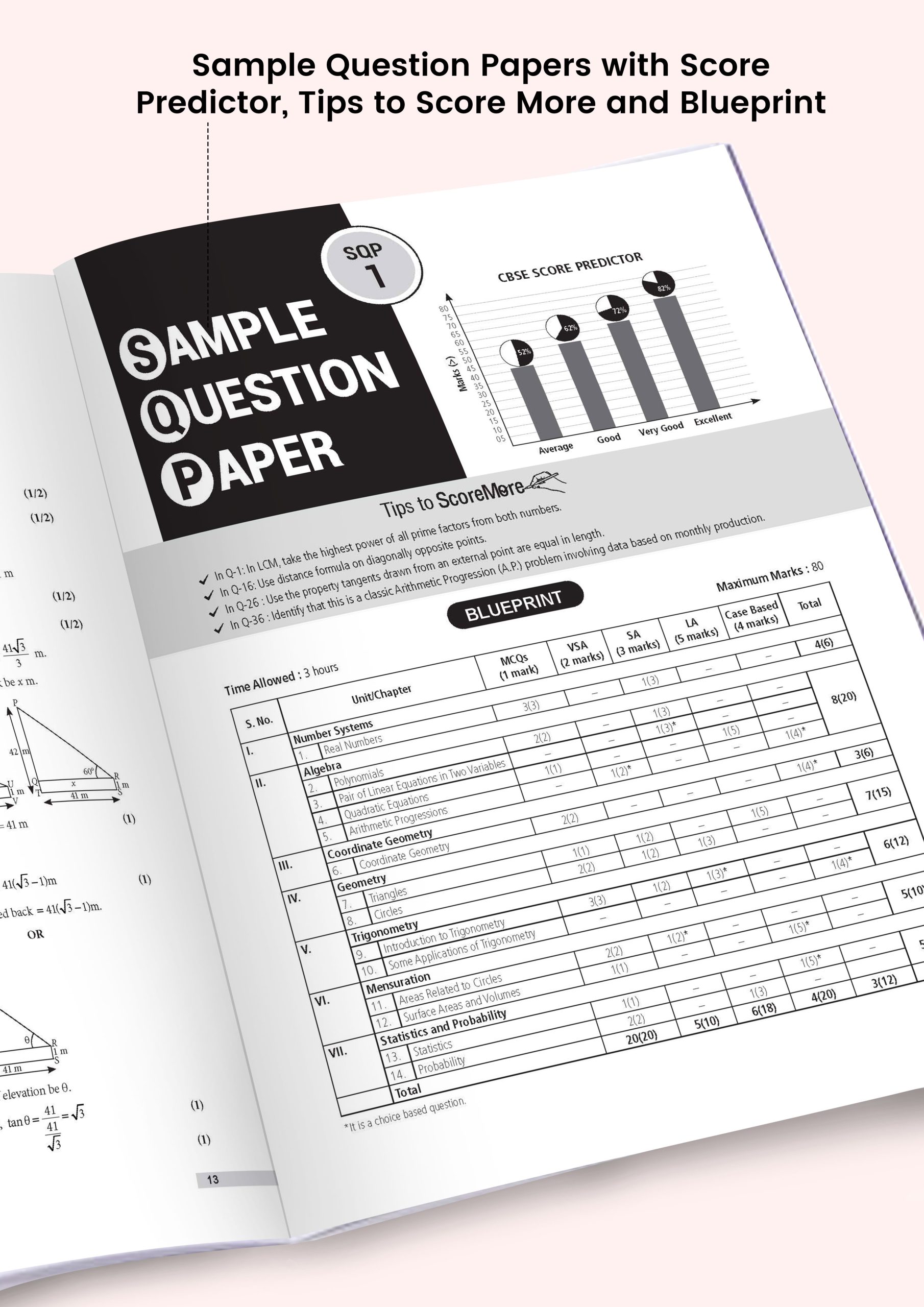 MTG brought to you CBSE ScoreMore 15 Sample Papers for Class 10. It includes all types of question typologies on the current syllabus and pattern to help you practice more and score more in the CBSE Board exams in 2026. All sample papers include all question typologies, 15 SQPs based on the latest Sample Papers issued by CBSE on 30th July 2025. Solutions of all SQPs as per the CBSE Marking Scheme. Solved CBSE Official Sample Paper included new features like Important Formulae, CBSE Score Predictor, Tips to Score More, etc.